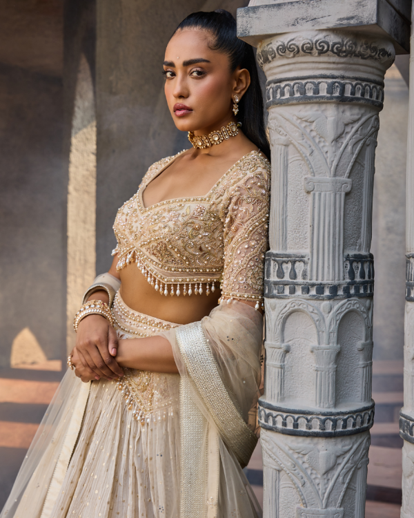 - Dupatta: Lightweight net dupatta with zari border, adding elegance and balance to the heavily worked ensemble.