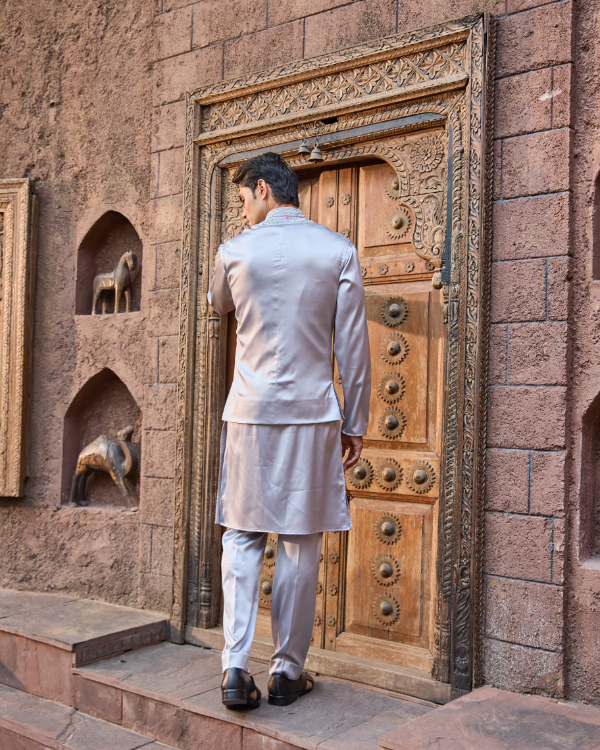 Silver Satin Bandhgala Jacket Set with Hand Work Detailing